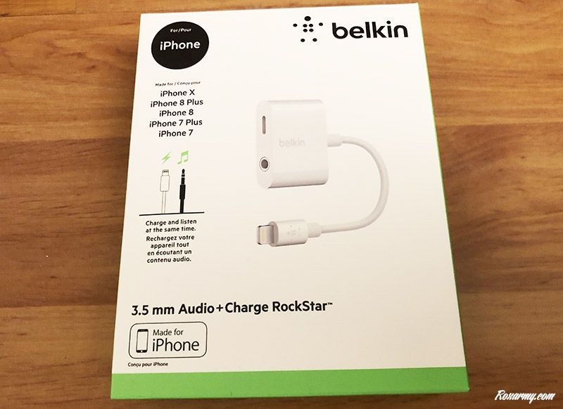 Après Lightning Audio + Charge Rockstar, Belkin propose le combo 3.5mm Audio + Charge Rockstar. Sur un packaging minimaliste se trouvent le logo de la société, la photo de l’adaptateur, à 3 reprises la mention que le produit est destiné aux Iphones notamment à partir de l’iphone 7.