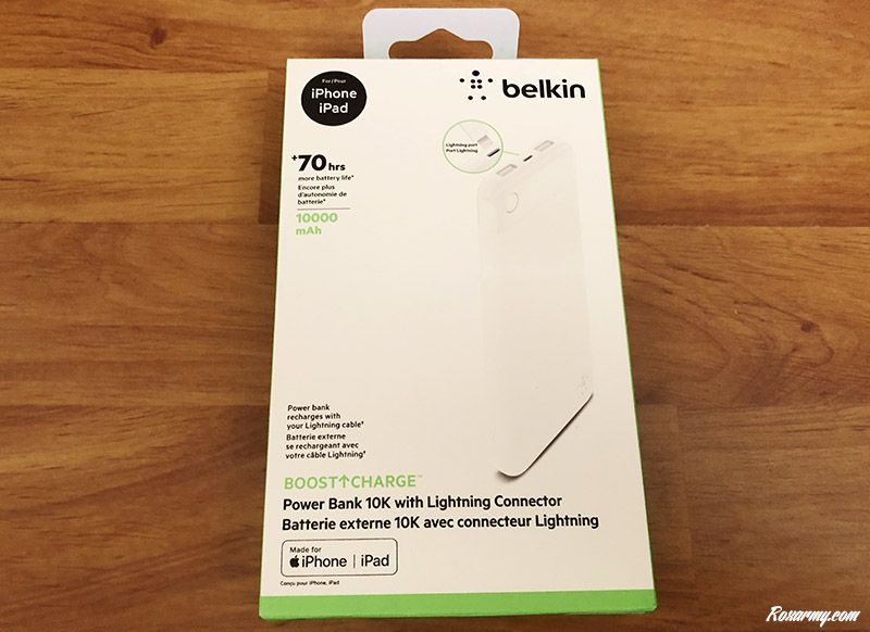 Pour répondre à la question de l’autonomie de l’Iphone, la firme de Cupertino ne propose rien d’autre que sa coque batterie Smart Battery Case. Parmi les solutions Belkin figure le BOOSTCHARGE Power Bank 10K avec connecteur lightning au packaging comparable à celui vu précédemment.
