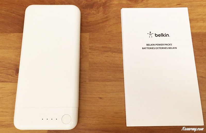 A l’intérieur se trouvent la batterie, un schéma d’utilisation et la déclaration multilingue de conformité aux normes européennes. Aucun chargeur USB ou câble lightning ne sont fournis, Belkin garantissant le bon fonctionnement de son produit avec ceux délivrés en standard par Apple.