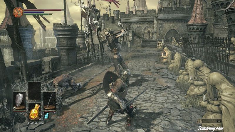 L’absence de carte du monde, la parcimonie des fioles d’Estus régénératrices de vie, le nombre accru de ennemis à combattre et le dynamisme des affrontements rapprochent le dernier des Souls du style Bloodborne issu du même studio.