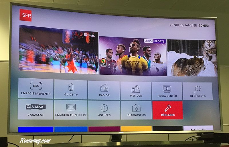 Le signal Wifi à 5Ghz MIMO 3×3 de sa puce Broadcom a permis d’afficher sans fil et sans saccades la chaine SFR Sport en 4K. Malheureusement absent durant la présentation un service de jeux vidéo en streaming fourni par Wiztivi et Broadmedia devrait s’afficher à terme dans l’interface.