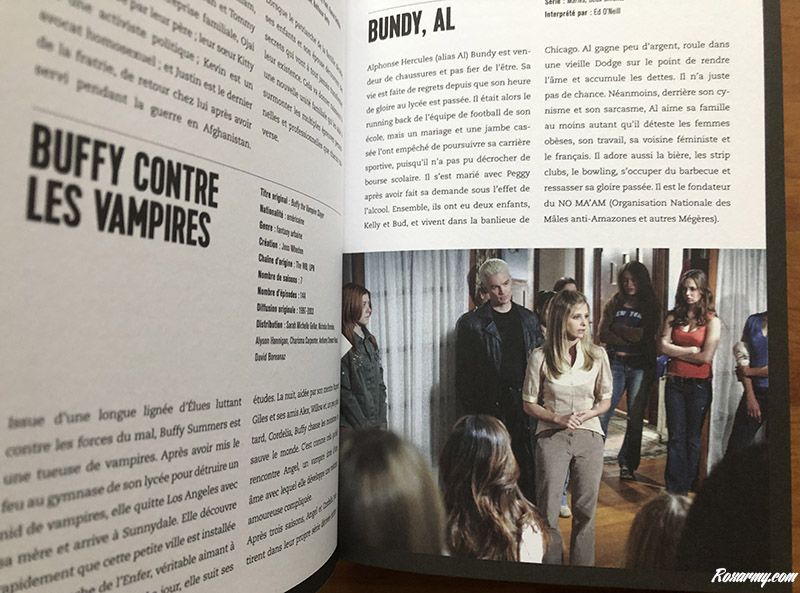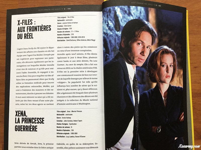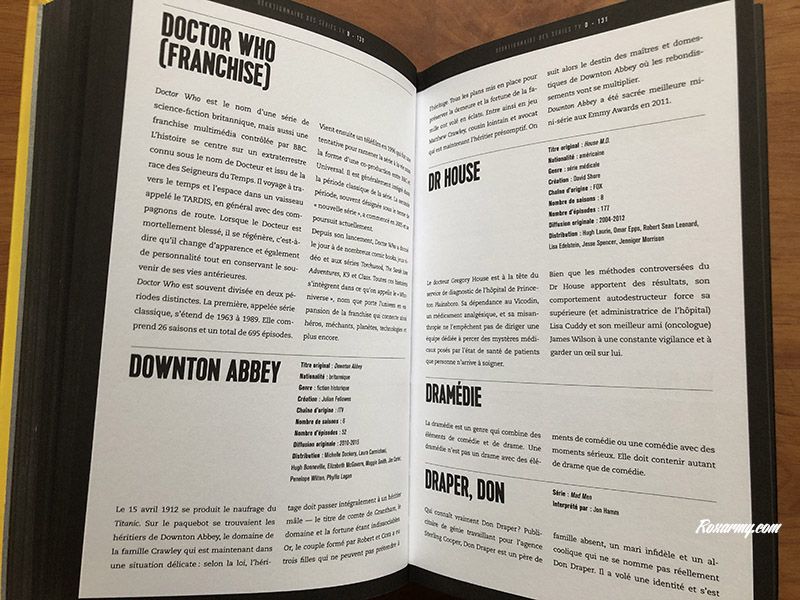 Outre les informations telles que le genre, le nom du créateur, le nombre de saisons et d’épisodes, on trouve un résumé suivi des fait marquants qui ont accompagné la série avant pendant voire après sa diffusion.Pour que la consultation de l’ouvrage soit agréable, les séries les plus populaires sont parfois illustrées par une photo expressément emblématique.