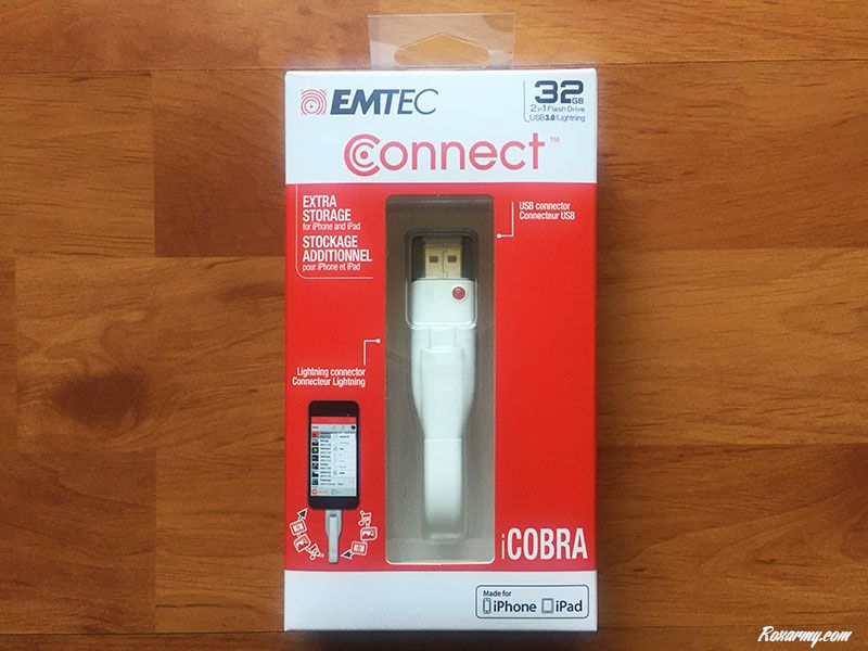 Icobra de la gamme Connect se présente dans un packaging aux couleurs de la marque avec une mise en avant du produit derrière un encart transparent. La capacité de stockage 32 ou 64 Go et les logos indiquant la compatibilité avec l’iPhone et l’iPad sont bien visibles en haut et en bas de la boite.