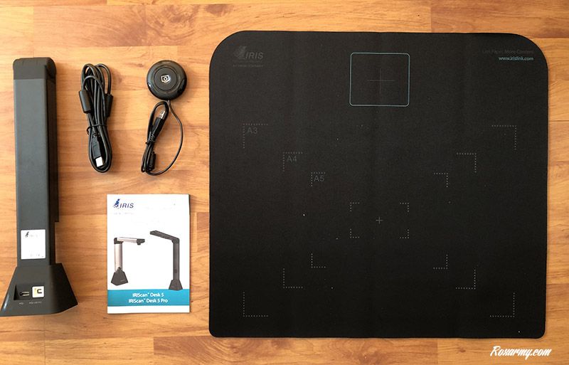 A l’intérieur se trouvent l’IRIScan Desk 5 Pro, un câble USB, un bouton de capture externe USB, un tapis, un guide de démarrage. La mise en fonction consiste à télécharger puis installer le logiciel Iriscan Desk, dérouler le tapis de numérisation, y positionner le scanner et à le brancher en USB à un PC.