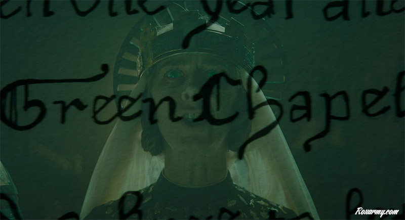 Quand un être végétal exhorte le roi Arthur et ses chevaliers à le frapper à condition qu’un an plus tard le porteur du coup se rende à la chapelle verte pour y recevoir la même chose, Gauvain qui ne s’est illustré d’aucun haut fait n’hésite pas. Il lui tranche la tête. En la ramassant le chevalier vert lui rappelle son rendez-vous avant de s’éloigner hilare.