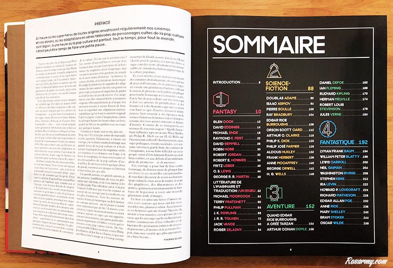 Chacune des 256 pages est une invitation à une lecture, un visionnage ou à parfaire sa connaissance des incontournables du fantastique, de la sf, de l’aventure et de la fantasy, les 4 tendances selon lesquelles sont repartis les écrivains.