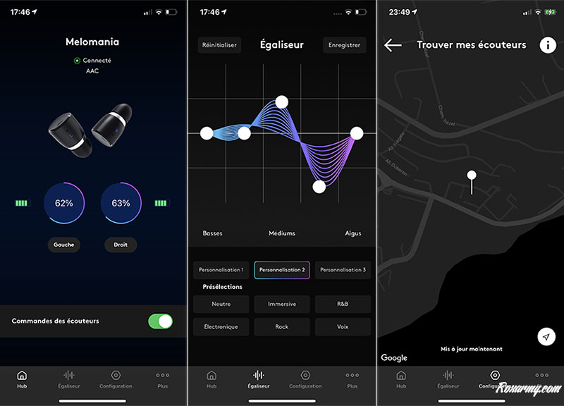 L’égaliseur de l’application permet 3 personnalisations en plus de 6 pré-sélections disponibles. En cas de perte il est possible de géolocaliser les Melania 1+ à condition d’avoir créé un compte. Malgré leur système de réduction de bruit, la performance des microphones gagnerait à être améliorée en milieu hostile