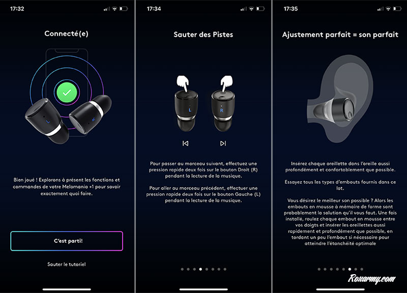 La mise en route commence par la sortie des intras de leur boitier, le lancement de l’application d’accompagnement Melomania sur smartphone et l’appui sur le bouton situé sur chaque écouteur. Celui entouré d’un halo bleu sert à l’appairage par Bluetooth et déclenche automatiquement la synchronisation avec le second.