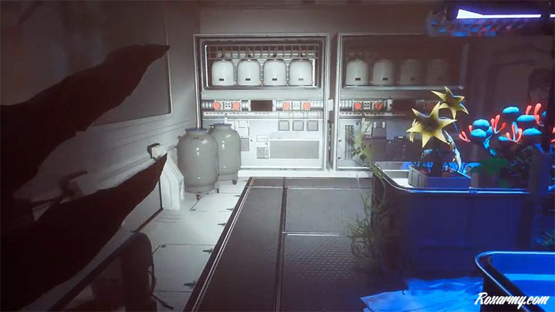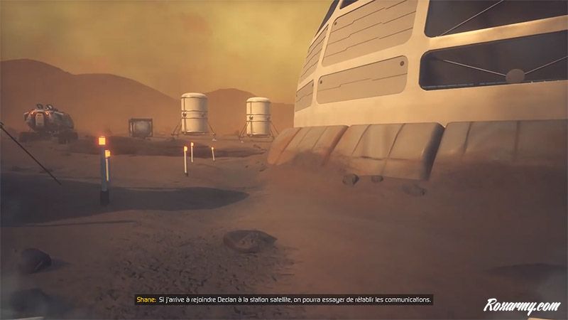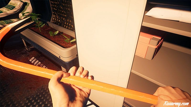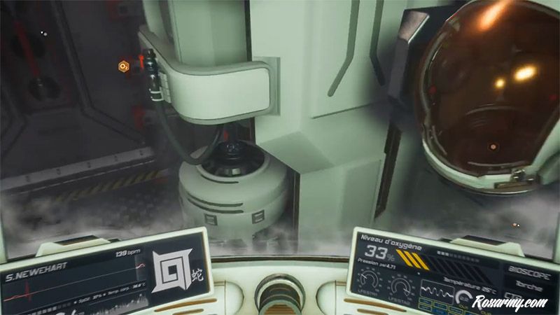 Ce « Pip boy » sert aussi à consulter l’inventaire et à contrôler ses signes vitaux. Ces derniers s’affichent également lorsqu’il enfile son casque de cosmonaute. Il sera alors question en extérieur de résoudre les énigmes dans un temps imparti où la gestion de la réserve d’oxygène est à coordonner avec les points de recharge environnants.