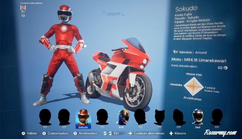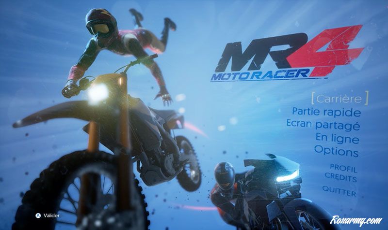 mr4-5En mode partie rapide (en solo on a le choix entre partie rapide et carrière) on a initialement accès à deux pistes en course et deux en cross, les autres sont à débloquer. 3 pilotes au choix, tout droit sortis des power rangers, avec des motos assez semblables de premier abord (ce sont surtout leurs spécificités techniques qui diffèrent). Les premières minutes sont un cauchemar : il faut deviner ou va la route, essayer de coller aux adversaires qui sont vraiment très solides même en mode facile. Impossible de suivre des yeux le plan de la piste tout en conduisant. On essaie d’être concentré, mais la moindre erreur vous renvoie en dernière place.