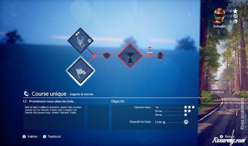 Un peu plus à l’aise avec le gameplay, on passe en mode carrière dans lequel on doit progresser en réussissant des épreuves et en gagnant des étoiles. On se heurte alors à un nouveau concept : il faut parier sur son classement suite à l’épreuve. Si on perd le pari on perd le nombre d’étoiles misées. Assez curieux et plutôt frustrant car là aussi on peu débloquer les épreuves suivantes, mais avec un faible montant d’étoiles. C’est pénible car parfois il faudra recommencer des portions débloquées pour obtenir les étoiles manquantes. Au risque de perdre celles précédemment obtenues…. La crise de nerf n’est pas loin.