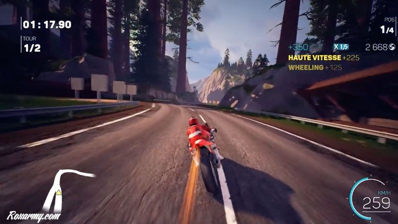 mr4-109On est clairement en mode arcade pur et dur. Vitesse énorme, gamelles à gogo sans conséquences, aucune gestion du grip (jamais la moto ne va déraper sur la route). Les paysages défilent, on se prend à aimer le coucher de soleil sur la route, les courses dans les forêts de pins… et surtout, on prend sa dose d’adrénaline, on enclenche le turbo dès que possible, on fait des sauts de plus en plus haut et des figures de plus en plus folles. Bref on s’éclate.