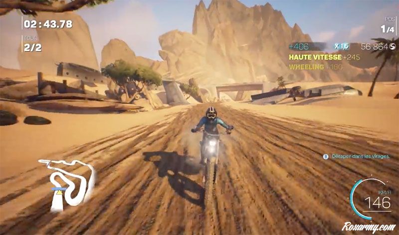 On tente le boost en wheeling, mais il est tellement violent qu’on hésite à le faire pour pas se manger un fossé. Les embardés envoient l’adversaire à vos cotés dans le fossé, si vous êtes bon en timing, sinon…. On retrouve des sensations de Road Rage, mais en plus rapide et moins violent. Petite tentative en moto cross, là ça va un peu mieux. C’est plus lent Le dérapage évite de devoir freiner, mais attention aux figures qui vous donneront du boost à la réception. Elles peuvent aussi vous mettre par terre si vous les faites au mauvais moment. Dans ce mode cross la piste est parfois impossible à suivre, elle se divise, certains passages sont délicats… bref là aussi on galère fort pendant les premières minutes voir la première heure.