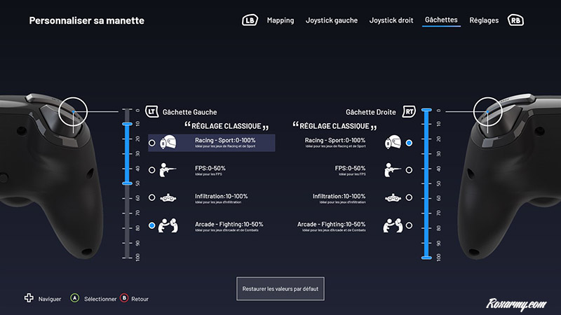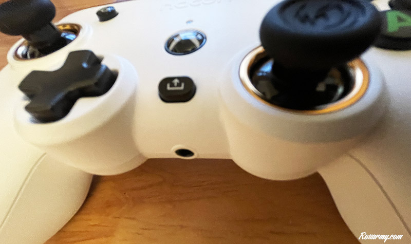 Au dos figure aussi un commutateur permettant de passer du mode classique à un profil personnalisé. L’application Nacon disponible sur le Microsoft Store a pour fonction entre autres de réassigner les boutons, modifier la réponse des joysticks et des gâchettes, de passer d’une croix 8 directions à 4 et inversement.