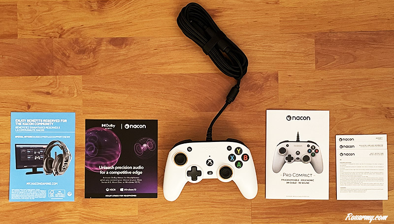 A l’intérieur se trouve une Pro Compact Controller, un manuel d’utilisation, la garantie, les informations de conformité réglementaire, les instructions de sécurité, un feuillet précisant l’activation possible de la technologie Dolby Atmos pour casque et une invitation à rejoindre la communauté sur my.nacongaming.com.
