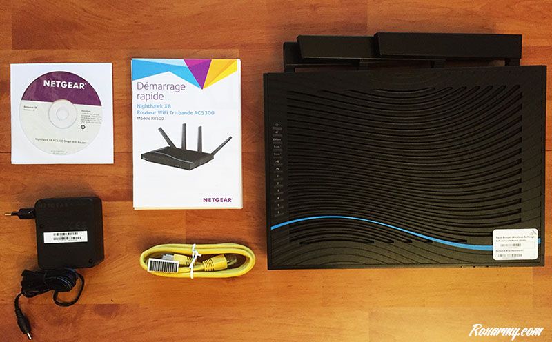 Il contient plusieurs guides de démarrage dont un en français, un CDROM, un câble Ethernet jaune et le routeur wifi tri-band AC5300. Contrairement à l’apparence biseautée du X4S AC2600, le Nighthawk X8 adopte un aspect plus conventionnel si l’on omet ses 4 antennes externes.