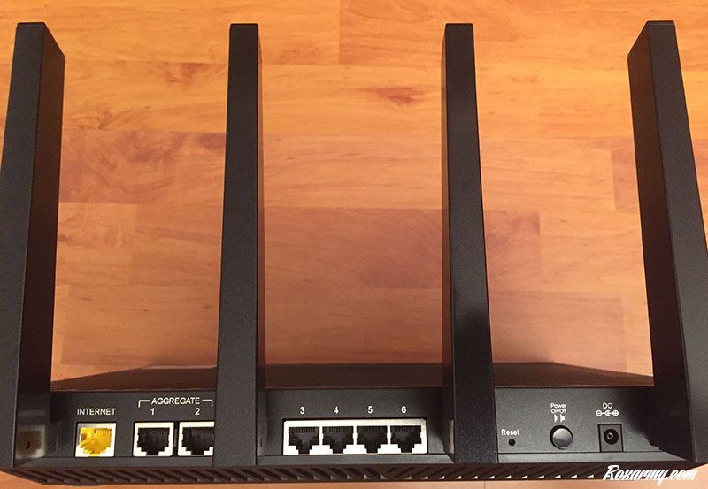 Derrière une trappe sur son coté droit se trouvent 2 ports usb 2.0 et 3.0. A l’arrière, parmi les 6 ports Ethernet, 2 peuvent s’agréger pour améliorer la vitesse de transfert des données. Un périphérique gourmand en bande passante comme un NAS ou une sauvegarde en profitera pleinement.