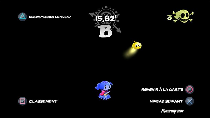 Il est alors possible de recommencer, revenir à la carte, consulter le classement ou de passer au niveau suivant. Pour y parvenir, Ka est capable de de courir, sauter plus ou moins haut selon la pression appliquée sur le bouton « Saut », de s’accrocher et de glisser le long des murs et de solidifier les nuages en glace, feu et électricité.