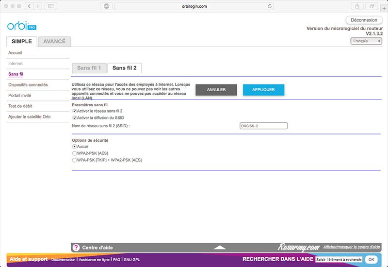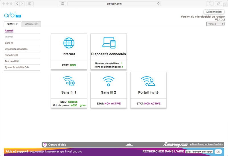 L’interface est proche de celle de l’Orbi grand public. Il apparait néanmoins une section pour la gestion de 3 signaux wifi distincts dont un dédié aux invités. Le partage d’imprimantes via USB a disparu faute de port à cet effet et le contrôle parental cède la place à une gestion par SSID de l’accès au réseau local.