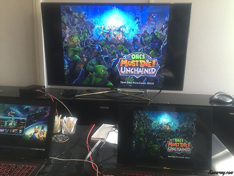 Avec plus de 50 défis, 8 cartes et 13 héros à paramétrer, Orcs Must Die! Unchained est taillé pour l’action et la coopération. 5 joueurs ne seront pas de trop pour venir à bout des hordes d’ennemis car malgré les facultés de mes associés de Robot Entertainmentent, la victoire s’est arrachée sur le fil. La pose stratégique de pièges s’avère particulièrement déterminante quand à l’issue d’une partie. A l’image de l’animation au style très bande dessinées dans les déplacements, pour signifier les coups infligés ou des graphismes aux effets de lumière colorés, le fun est l’impression ressentie quand on joue à OMD!U. Matthias Heillig le responsable des relations presse de Gameforge m’a indiqué que la sortie définitive du jeu est prévue pour fin mai, début juin et qu’une version sur PS4 suivra ultérieurement sans plus de précisions. Tous les efforts sont actuellement concentrés sur le PC. L’intégralité du jeu est jouable gratuitement. Le modèle économique étant le free to play, seuls les skins seront payants. Arrivant de Karlsruhe, Domink Nagel concepteur de jeu chez Gameforge et Harter Ryan, co-fondateur du studio spécialement venu de Plano au Texas etaient présents pour l’occasion. 1 millions de téléchargements plus tard, l’effet Orcs must die Unchained continue de faire boule de neige avec la mise à jour Serment au nom d’Arctos. Sa thématique polaire comprend une nouvelle carte, 2 Boss supplémentaires et un 13ème guerrier, Tundra qui ne laissera personne de glace.