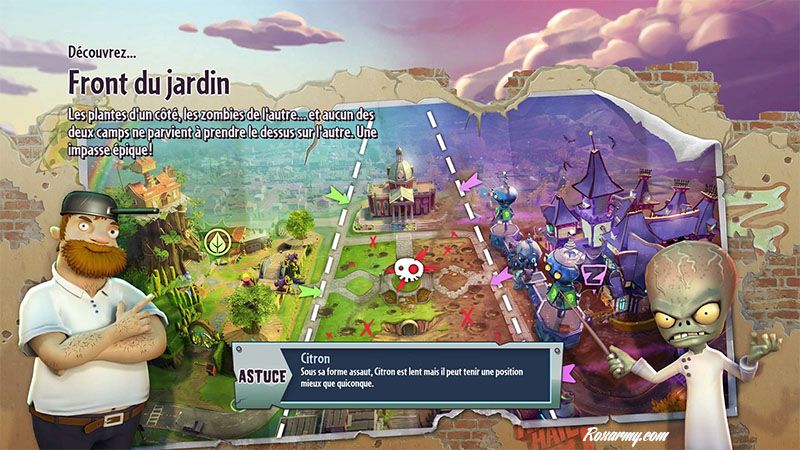 Depuis le front du jardin il vous revient d’organiser la reconquête de la région et de contrecarrer les plans hégémoniques du docteur Zomboss. Mais vous êtes aussi libre de rejoindre le camp des zombies pour en finir définitivement avec les plantes.