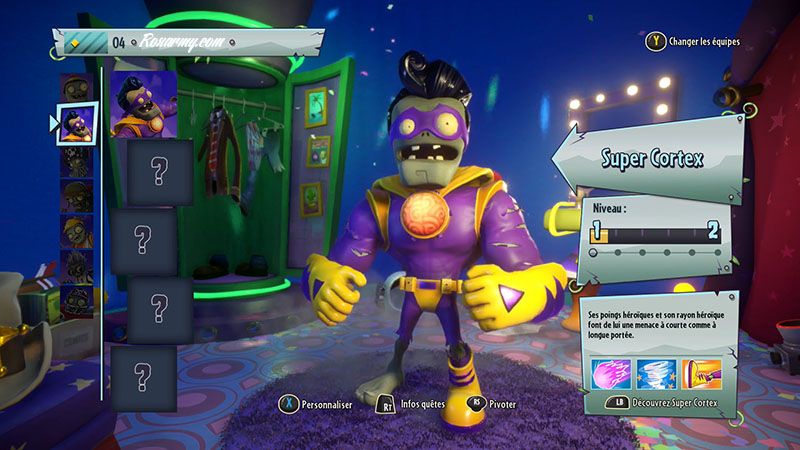 Chez les zombies, Super Cortex avec son air emprunté à Captain Qwark de Ratchet & Clank peut compter sur ses poings ravageurs, son rayon héroïque ou encore son aptitude à se transformer en tornade dévastatrice pour tenir les plantes en respect.