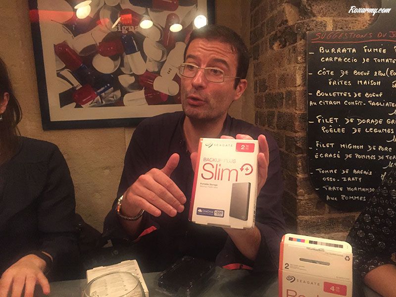 Les rencontres avec les chefs produit telles que les organise Seagate sont une approche moins formelle et moins marquetée qu’une présentation presse. Avec son cadre sympathique et son enseigne ultra geek, se donner rendez-vous au Signal en envoyait un très bon. Pour parler de ses différentes gammes, Seagate avait envoyé un ambassadeur. Philippe Rault, chef produit International EMEA s’est volontiers prêté à l’exercice. Il a commencé par le Personal Cloud 2-Bay. Cet élégant boitier noir contient deux disques durs qui fonctionnent en miroir ou en mode étendu. En le branchant en Ethernet sur une box, il permet d’avoir accès à toutes les données qui y sont stockées en mobilité ou depuis un poste fixe grâce aux applications dédiées. Pouvant atteindre les 8 To, le Personal Cloud 2-Bay se démarque d’un NAS par sa philosophie et son ergonomie orientée grand public. J’avais déjà rencontré le Wireless plus au fantôme mais pas son benjamin. Plus fun avec son look arrondi et ses différents coloris, le Wireless reprend la caractéristique principale de cette famille : la diffusion de contenu sans fil sur appareils mobiles. Dans la catégorie des Backup Plus, les disques externes Slim sont les plus fins du marché. USB 3.0, ils sont tous livrés avec le logiciel de sauvegarde Seagate Dashboard et propose gratuitement un stockage additionnel de 200 Go avec One Drive durant 2 ans. Philippe nous a présenté les modèles 1, 2 et 4 To. Le 1 To a une finition très macbook dans l’esprit. En plus d’être garantie 2 ans, en cas de défaillance du disque la récupération de données en salle blanche est offerte. Le coût conséquent de ce type de service est la meilleure preuve de fiabilité que pouvait faire Seagate. Comme pour l’usage étendu du Personal Cloud 2 bay, toujours très fin, le 2 To propose plus de capacité de stockage mais sans la garantie de récupération de données gratuites. Il se décline en 5 couleurs bleu, rouge, gris, blanc et noir. Enfin après le Seagate Game Drive destiné à la console de Sony, j’ai enfin pu découvrir son équivalent pour Xbox. Contrairement à son homologue pour PS4, le Game Drive pour Xbox peut se raccorder aux consoles de Microsoft sans avoir recours au tournevis. Il suffit de le brancher en USB sur la Xbox pour étendre de 2 To sa capacité initiale. Cette solution présente aussi l’avantage de transporter tous les jeux qui y sont stockés afin de jouer sous son profil Xbox Live sur une autre console. 14 jours d’essai sur le Xbox Live Gold sont d’ailleurs offerts. Malgré le large éventail présenté et certaines questions extrêmement pointues aucune n’est venue à bout des connaissances de Philippe. En guise d’ambassadeur, Seagate avait envoyé un véritable chevalier Jedi du stockage personnel.