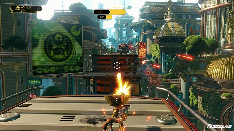 ratchet-clank-6Aux traditionnels boulons en or permettant de débloquer des bonus viennent s’ajouter du raritanium et des holocartes à collectionner. Compléter une série permet d’augmenter sa récolte de boulons ou encore d’obtenir le redoutable lance missile T.E.L.T.