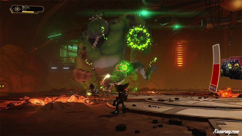 ratchet-clank-4Ces 2 armes font partie d’un arsenal qui en comprend 14 au total et auquel il est possible d’avoir recours en progressant dans l’aventure. Les développeurs d’Insomniac Games étant de grands fans de science fiction, de nombreux clins d’oeil propres au cinéma fantastique émaillent ce nouvel opus.