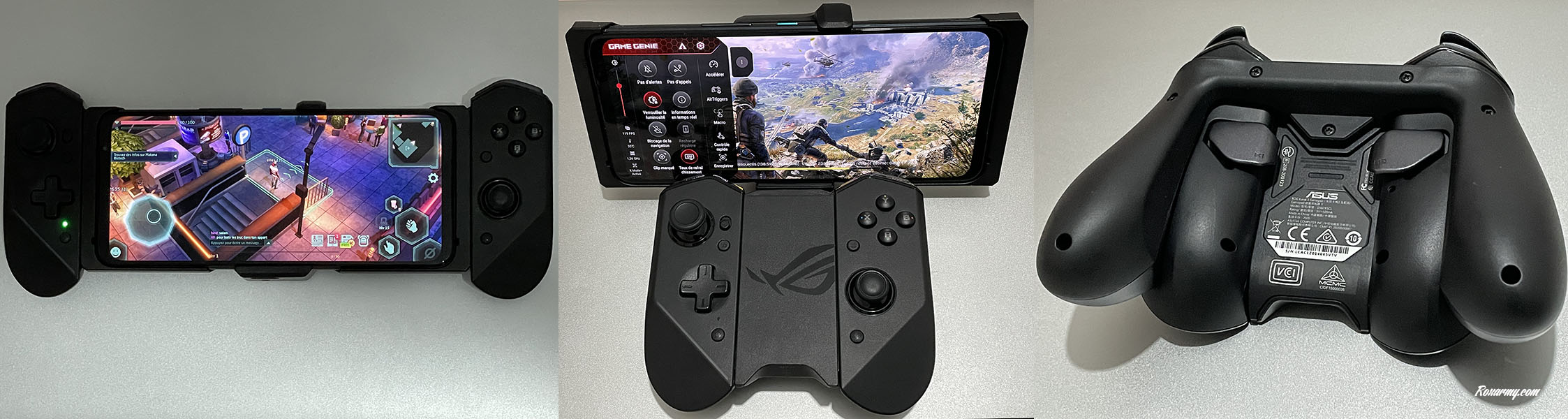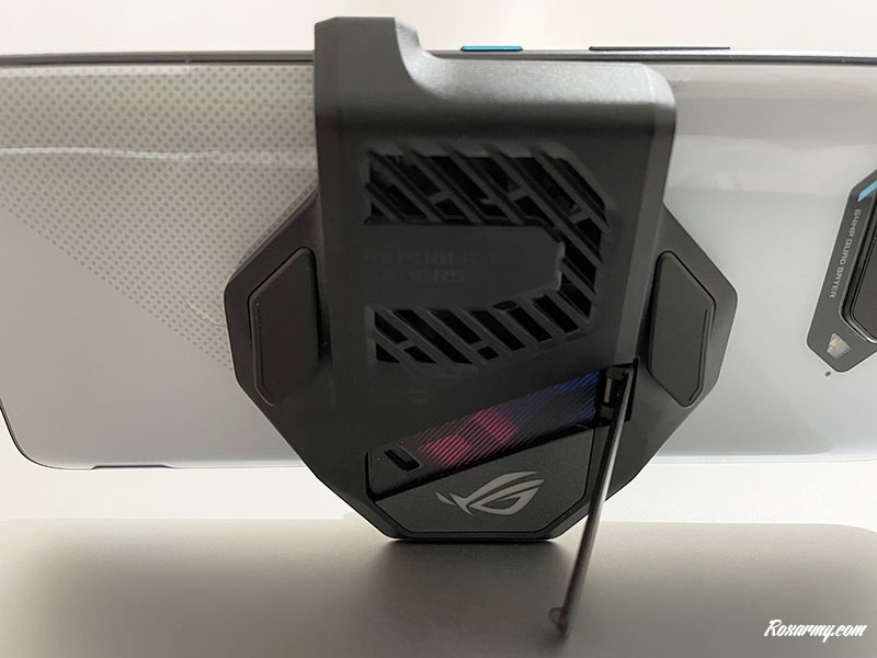 L’écosystème des accessoires ROG entre alors en jeu avec l’Aero Active Cooler 5 un ventilateur externe qui en s’alimentant depuis la prise dédiée, redirige plus d’air sur la coque arrière du ROG Phone. Il lui ajoute 2 boutons physiques correspondant aux gâchettes basses d’une manette et dispose d’un pied pour faire office de stand.