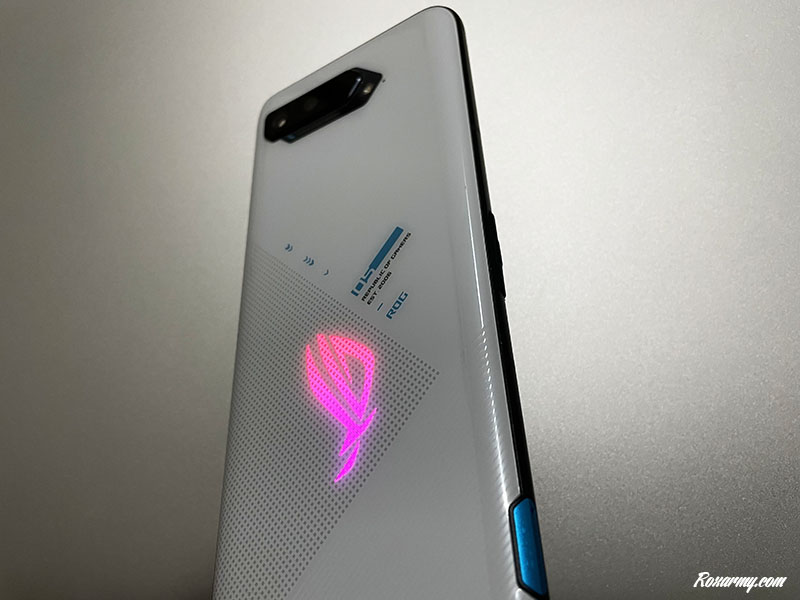 Le design du ROG Phone 5 persiste dans une sobriété qui ne renie en rien son ADN gaming. Au dos son logo en pointillé affiche grâce au système RGB Aura, 2 couleurs simultanément et bénéficie d’effets lumineux. Au bout d’un moment ses 239g pour 173mm de long 77mm de large et 9mm d’épaisseur se font bien sentir.