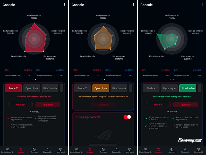 Si pour le calcul le ROG Phone utilise le même processeur Snapdragon 888 cadencé à 2,84 gHz que le Zenfone 8, la différence se situe dans la gestion optimisée de toute cette puissance. La plateforme Armoury Crate permet ainsi de sélectionner manuellement parmi plusieurs modes celui qui se prête le mieux à la situation.