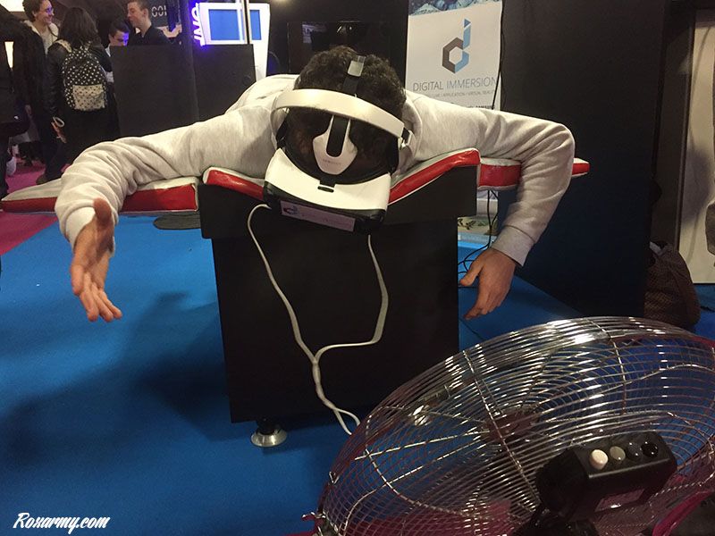 La simulation proposée par Digital immersion consistait à donner l’impression au visiteur de voler en Wingsuit. Comme l’attraction Rabbit VR que j’avais testé au salon Kazachok, aux casques VR projetant les images venait s’ajouter la sensation d’être dans les airs grâce à un ventilateur.