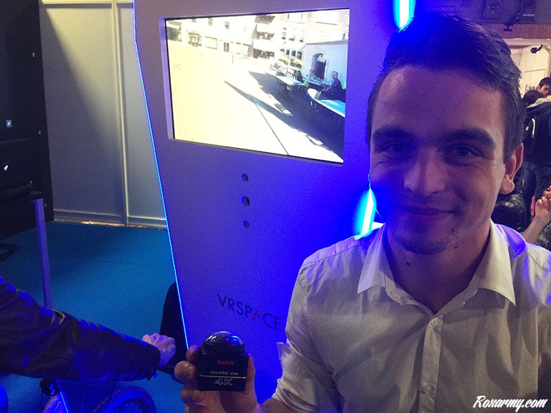 Après le Profrom d’Ifit, VRSpace présentait une autre forme de vélo connecté. Grâce à un capteur fixé sur un pédalier, son VRbike permet d’effectuer une ballade en 3D stéréoscopique à travers des paysages enregistrés. Pour y parvenir la société néerlandaise a fait usage de cameras Kodak Pix Pro 360.