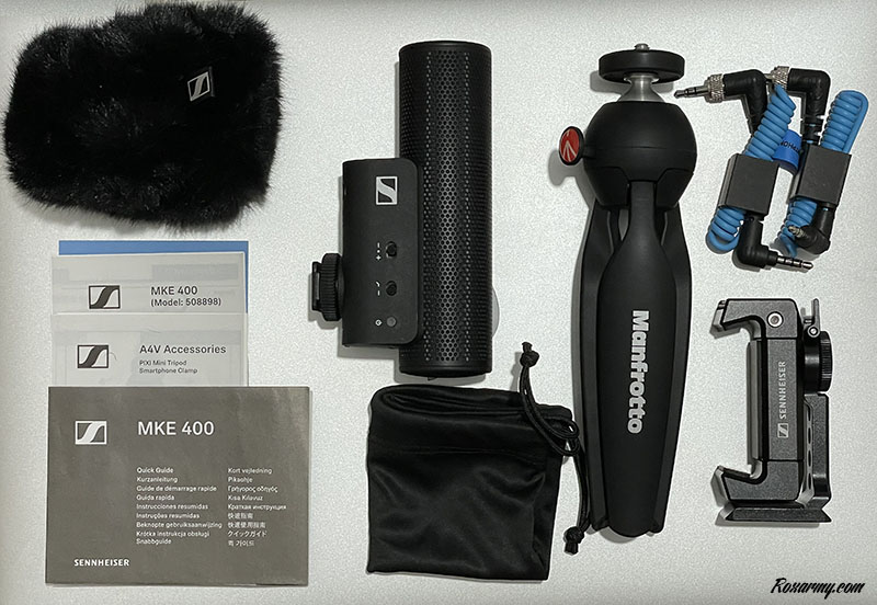 A l’intérieur se trouvent le MKE 400, une bonnette anti vent en fourrure, une pince pour smartphone, un tripod Manfrotto PIXI, 2 piles AAA, une pochette à cordon, un guide de démarrage rapide, des consignes de sécurité, de la documentation, un câble audio jack male male pour appareil photo et un autre pour smartphone.