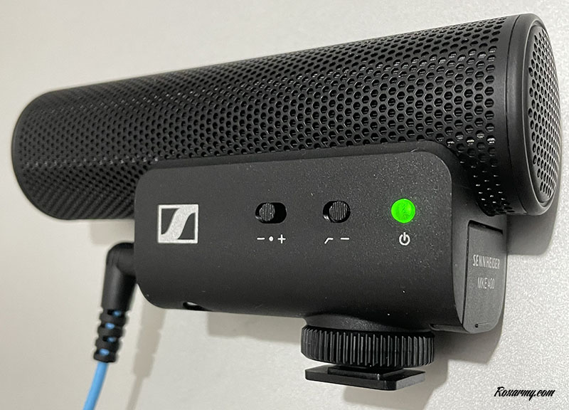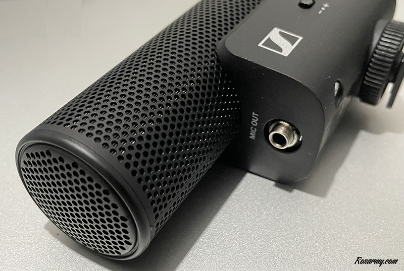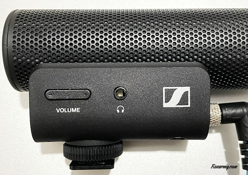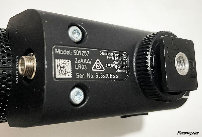 Sur la tranche droite est installée une sortie casque de contrôle pour les caméras qui n’en sont pas pourvues. Juste à côté se trouve un bouton permettant d’ajuster le volume du casque. Sur le dessous du micro est collée une étiquette où sont inscrits la référence du modèle, le numéro de série et l’adresse de Sennheiser Allemagne.