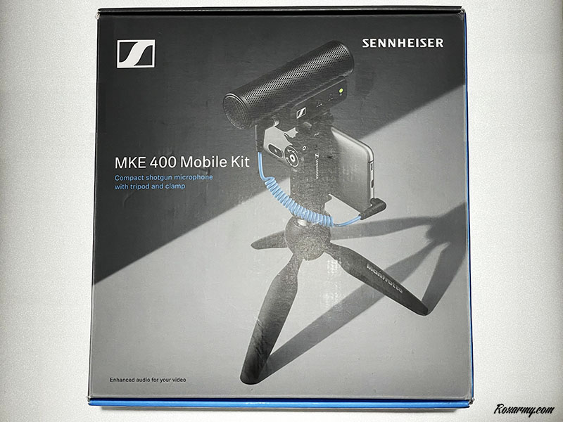 Le packaging est assez conséquent avec en fond une photo aux trois quarts du MKE 400, en haut à droite Sennheiser écrit en toutes lettres, à gauche le logo associé, juste en dessous le nom commercial du produit suivi de son descriptif et enfin tout en bas le slogan : de l’audio amélioré pour vos vidéos.