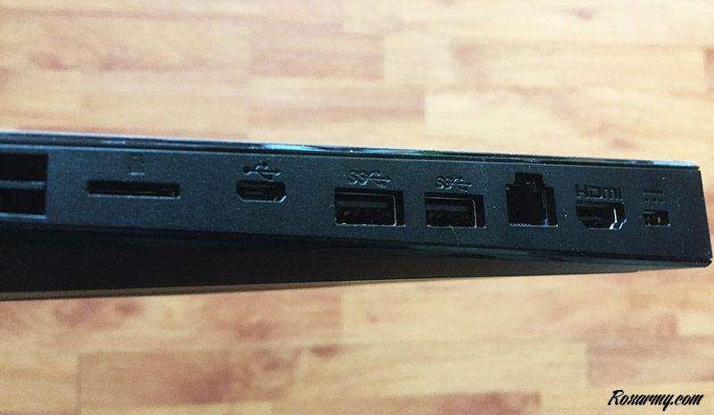 De la taille d’une tablette 8 pouces, noir glossy, son design plutôt futuriste mais sobre la rend parfaitement compatible avec le salon. A l’arrière, sa connectique comprend un emplacement SD, 3 port USB dont un micro, un port Ethernet, une entrée HDMI et une prise pour l’alimentation.