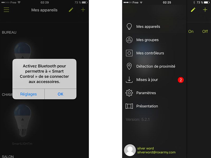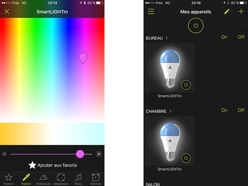 awox smartlight-2L’installation d’une deuxième ampoule s’est effectuée sans soucis. Il est possible de la piloter sans être présent dans la pièce où elle se situe, de changer sa couleur, son intensité, de programmer des séquences ou son allumage. Un témoin aussi permet de connaitre son état (on ou off).