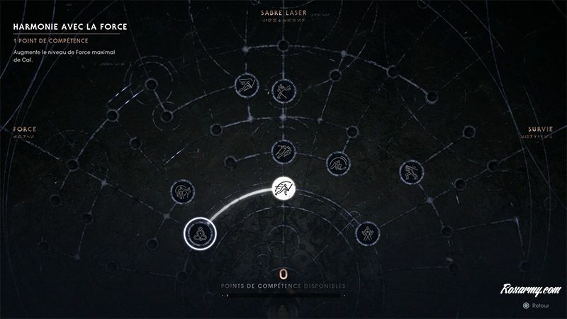 Au fur et à mesure de sa progression, Cal obtient des points qui lui permettent de débloquer des compétences. Accessibles depuis les cercles de méditation, elles sont réparties selon 3 grandes orientation la survie, le sabre laser et la force. Chaque décision influencera la jouabilité pour qu’elle soit conforme au style de jeu pratiqué.