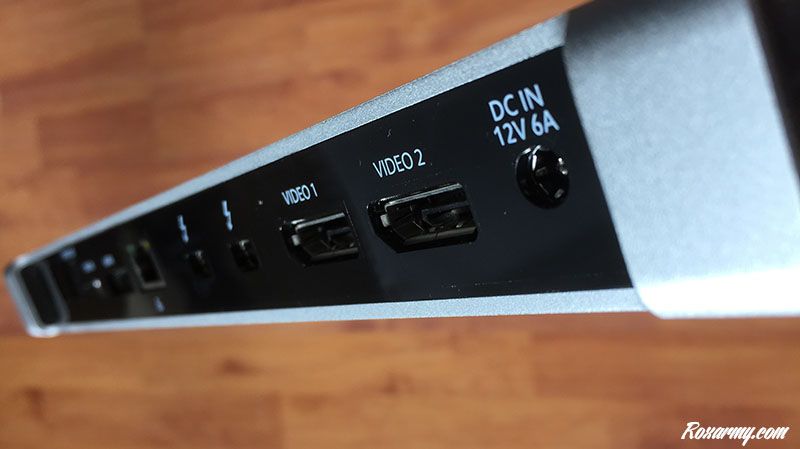 Livrée avec un mode d’emploi en anglais uniquement, 3 différents câbles d’alimentation et un câble Thunderbolt, elle se branche via l’un de ses ports Thunderbolt 2. Il est possible alors d’utiliser 2 écrans simultanément en Displayport dont un avec une résolution 4K soit 3840 x2160.
