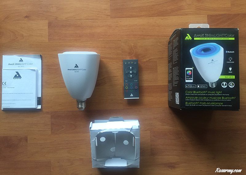 A l’intérieur se trouvent un mode d’emploi, la garantie, une télécommande et bien entendu l’ampoule parfaitement maintenue par une cale en carton.