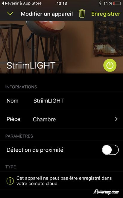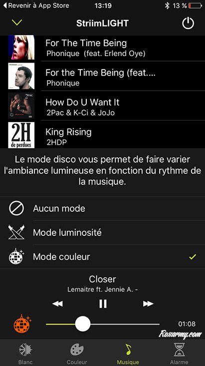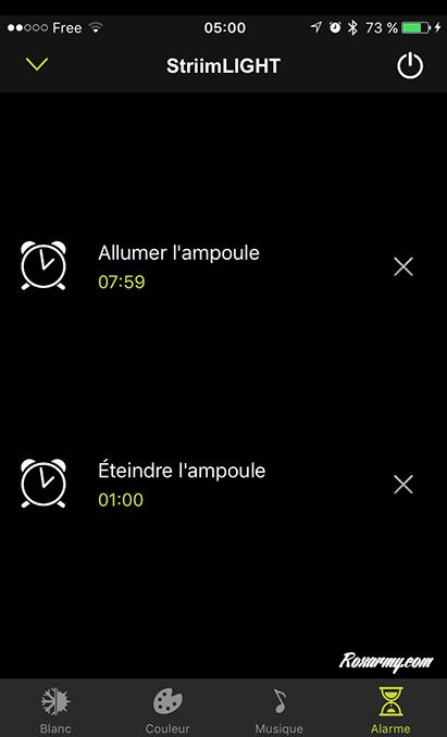 En plus des fonctions de la télécommande, l’application propose de pouvoir programmer l’allumage et l’extinction de l’ampoule aux heures de votre choix et diffuse vos morceaux de musique par ordre alphabétique.
