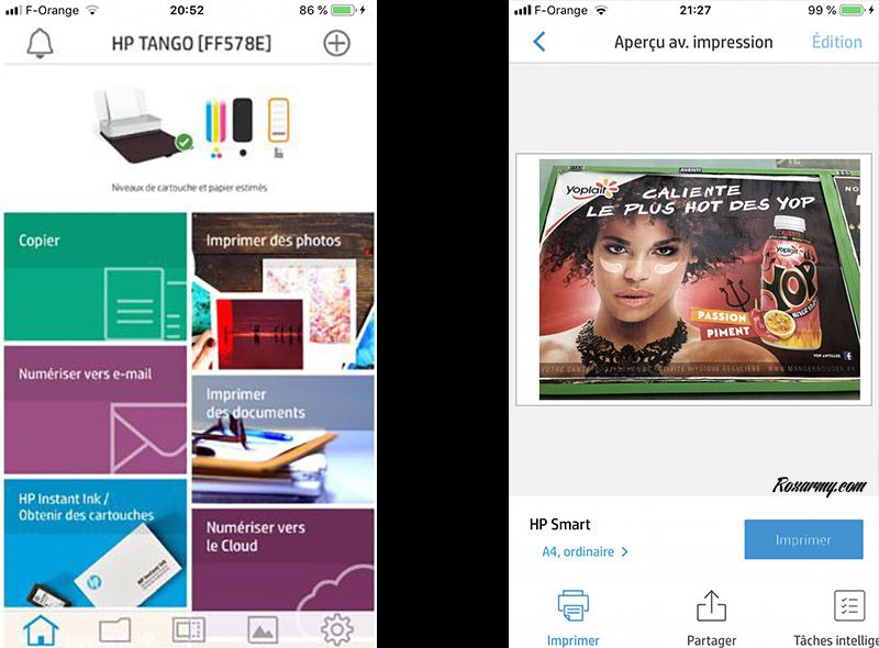Spécifique à la Tango, toutes les photos aux dimensions 13×18 cm maximum imprimées via HP Smart ne sont pas décomptées des forfaits. Au lancement de l’application, l’imprimante est automatiquement détectée et connectée au réseau en wifi après la saisie de la clé WEP via le bluetooth.