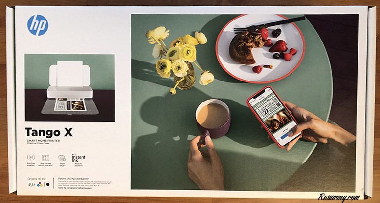 Contrairement à ce que l’on a l’habitude de voir en matière de packaging, l’imprimante d’HP est représentée dans une version dessin stylisé qui occupe le tiers du carton. L’accent est surtout mis sur les 2 tiers restant où une utilisatrice prend un petit déjeuner frugal, son smartphone à la main.