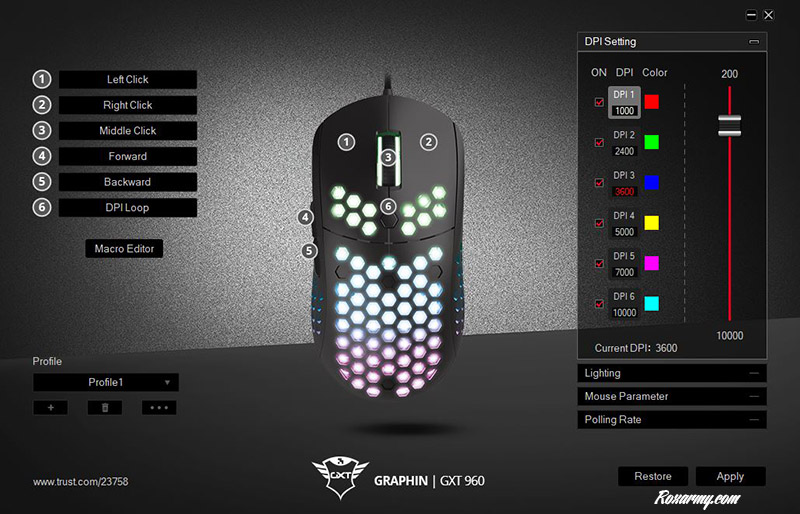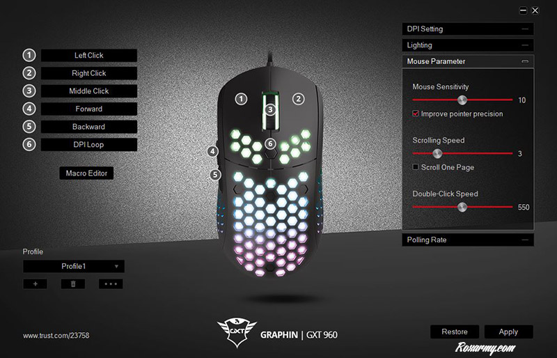 L’application offre aussi la possibilité de modifier les paramètres de la souris tels que son taux d’interrogation, sa sensibilité, la vitesse de défilement, du double clic et la précision du curseur. La couleur affectée à la valeur de chacun des 6 niveaux de DPI clignotera 3 fois à chaque sélection du bouton dorsal.