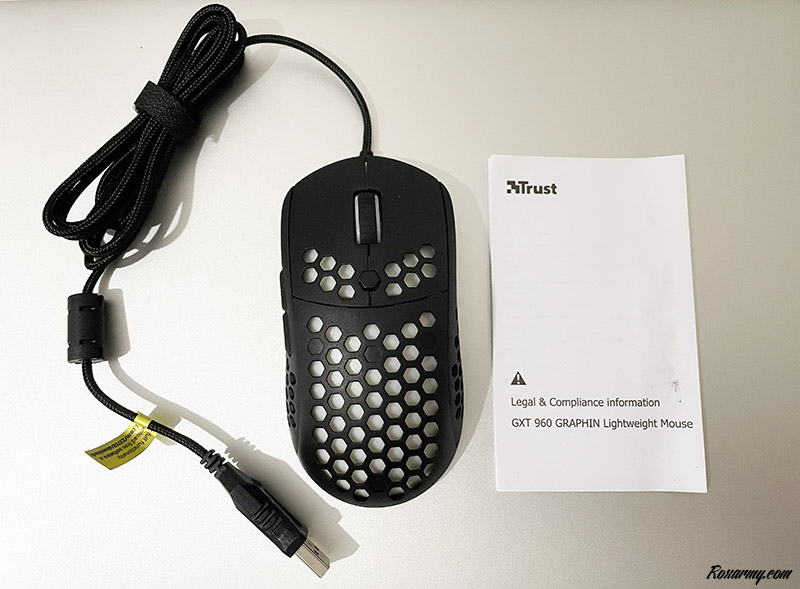 Le contenu de la boite est réduit à son expression la plus simple. La souris poids plume GXT 960 Graphin est seulement accompagnée d’un livret contenant les informations légales de conformité aux normes européennes et indiquant que le support technique se trouve sur internet à l’adresse http://www.trust.com/23758