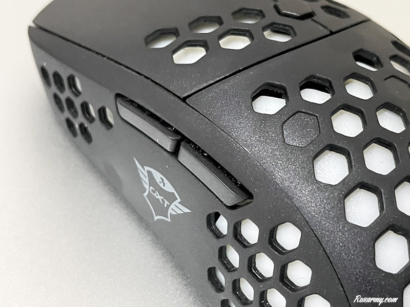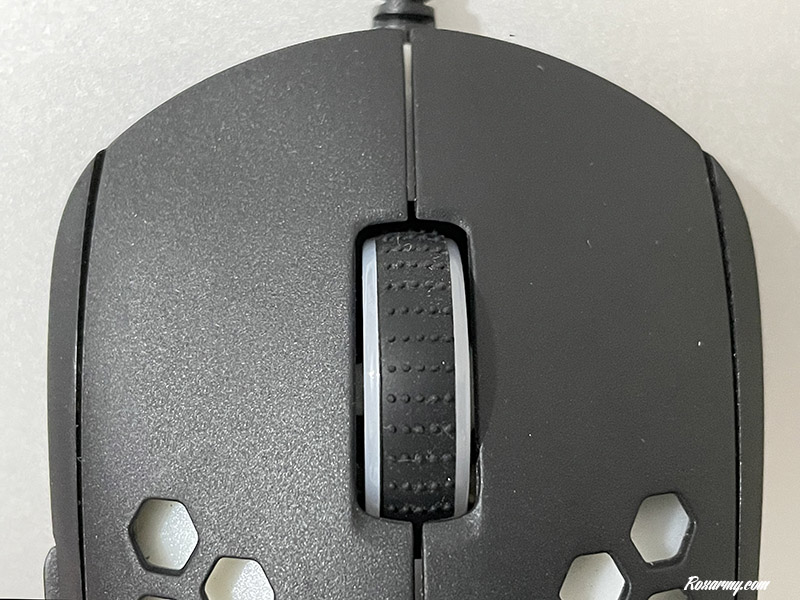 Bien que les parties alvéolées en contact ne soient pas inconfortables, celles cliquables sont toujours pleines, que ce soit sous les 2 boutons au niveau du pouce ou les clics gauche et droit qui bénéficient de Switch Omron. La Graphin est aussi dotée d’une molette crantée pour le défilement vertical, translucide sur les côtés et cliquable.