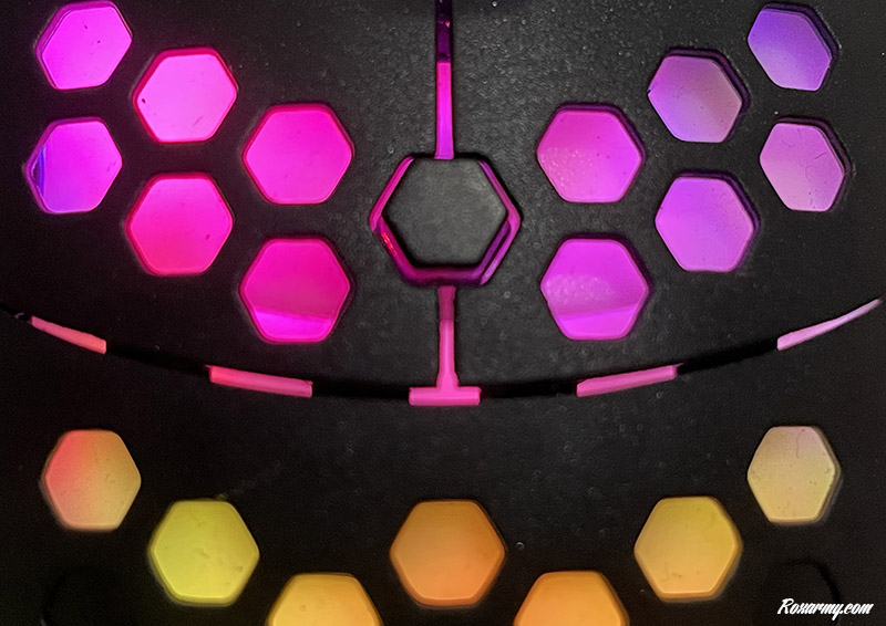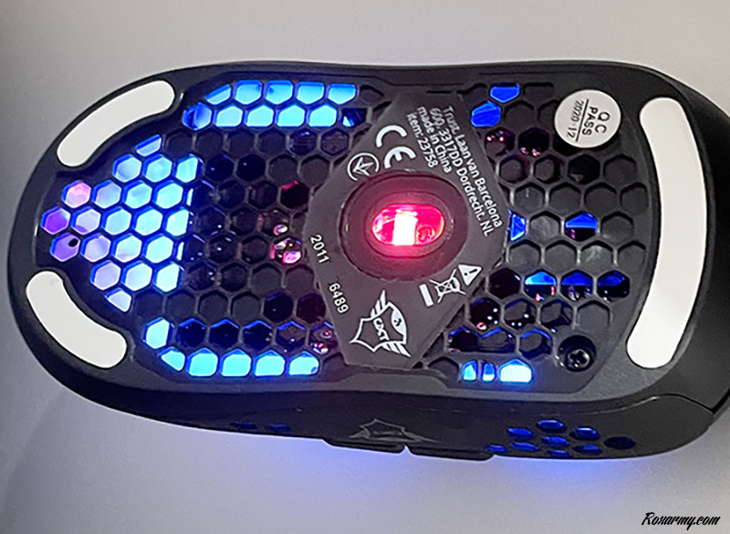 Son design est élaboré avec sa robe noire alvéolée. En dessous se trouve une coque en plastique translucide opaque permettant de diffuser la lumière. Avec 6,3 cm de large, 4 cm de haut et 12,6 cm de long pour 74g, la souris convient à une main de taille moyenne et tient parfaitement la paume à plat contre sa surface.