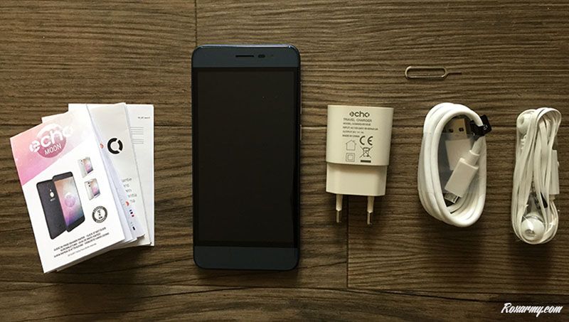 Pour permettre l’achat de ses smartphones en grandes surfaces comme cela se ferait pour de la lessive  Echo mobile a sérieusement considéré la protection contre le vol. Sans une bonne paire de ciseaux, cutter ou autres outils bien tranchants, il est impossible de libérer le Moon de son carcan protecteur.Après déballage on découvre alors l’Echo Moon, des écouteurs, un câble Mini USB, un chargeur, un éjecteur de carte SIM, un guide de prise en main et la garantie. L’esthétique de l’Echo Moon est plutôt léchée. Disponible en blanc et en argent, le bleu lui confère une élégance un peu plus masculine.